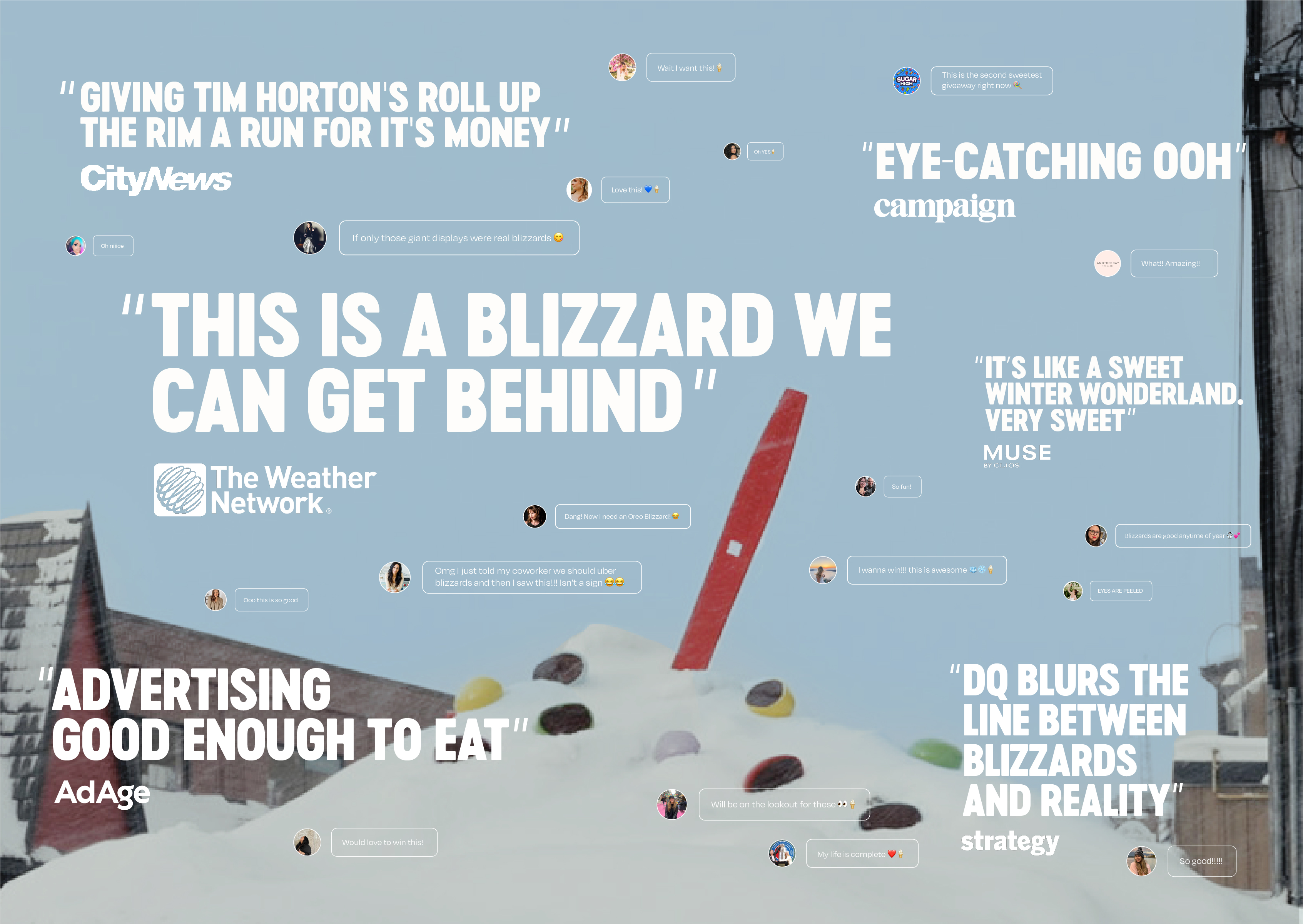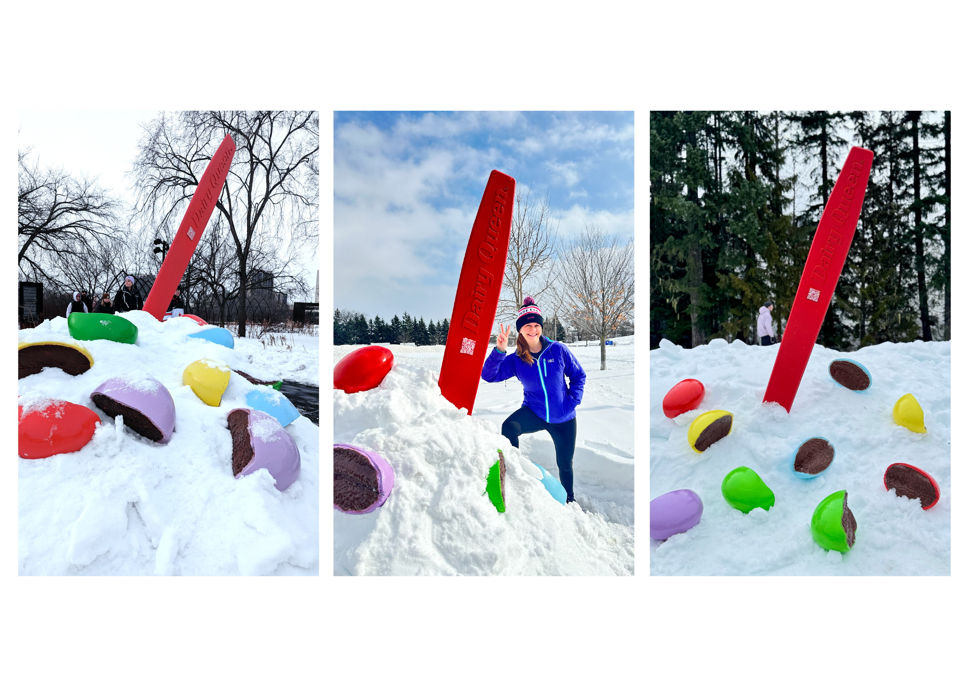 The campaign transformed winter itself into the medium by turning snowbanks into oversized Blizzard treats. Following one of the snowiest winters in years, naturally formed snowbanks were converted into large-scale installations using custom-built red spoons and Smarties toppings. These “Blizzard Banks” appeared overnight in Ottawa, Collingwood, Winnipeg, Calgary, and Whistler, surprising people as they went about their winter routines.